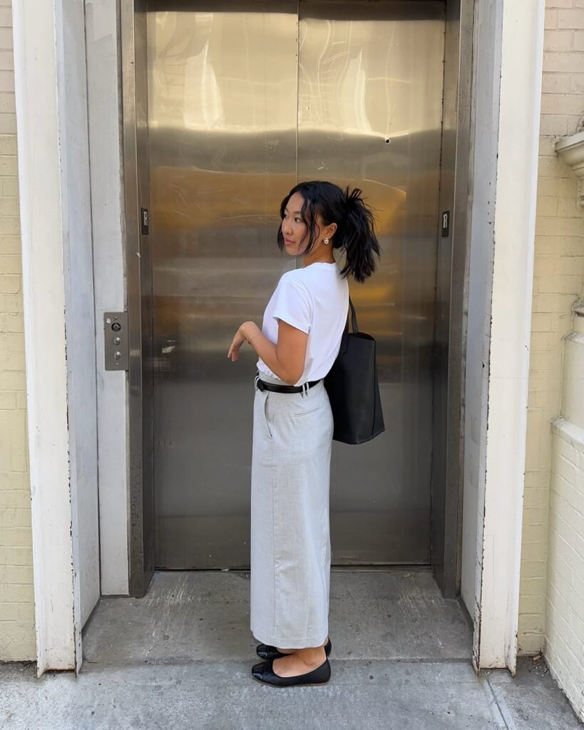 This outfit is the perfect blend of casual sophistication. The tailored linen column skirt elongates the silhouette with clean, structured lines, while the relaxed cotton tee introduces softness and comfort. It’s an excellent choice for warm climates or creative offices, keeping you cool while looking polished. The pairing proves that laid-back pieces can feel elevated when thoughtfully balanced with strong tailoring and refined styling.