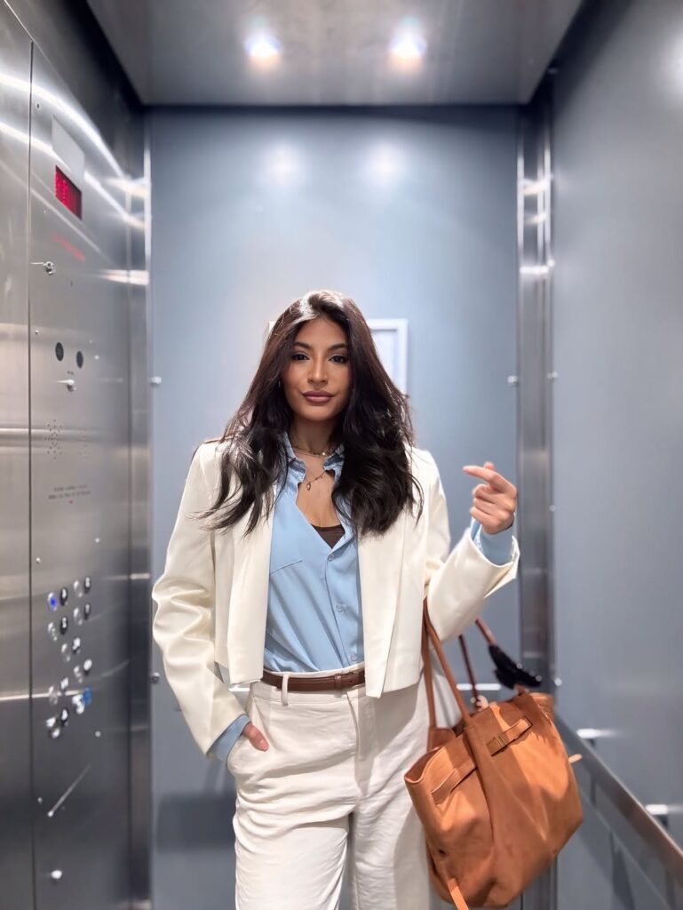 Soft cream tones paired with a blue silk blouse create a polished, graceful color palette ideal for professional environments. The silk blouse adds luxurious movement, while the cream suit keeps the look crisp and structured. This outfit is perfect for interviews, presentations, or client-facing roles where you want to appear composed and elegant. The combination of luxe fabrics and tailored shapes creates a timeless impression.
