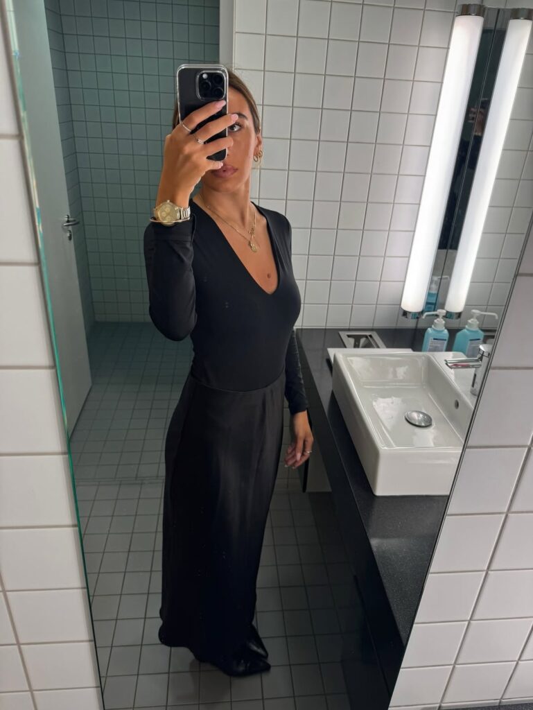 Modern, feminine, and effortlessly chic, this combination is ideal for women who love fluid silhouettes. The jersey bodysuit creates a smooth, fitted base that pairs beautifully with a flowing satin maxi skirt. This outfit works well for office events, presentations, or days when you want to feel extra polished without sacrificing movement or ease. The contrast between structure and softness gives the look striking visual harmony.