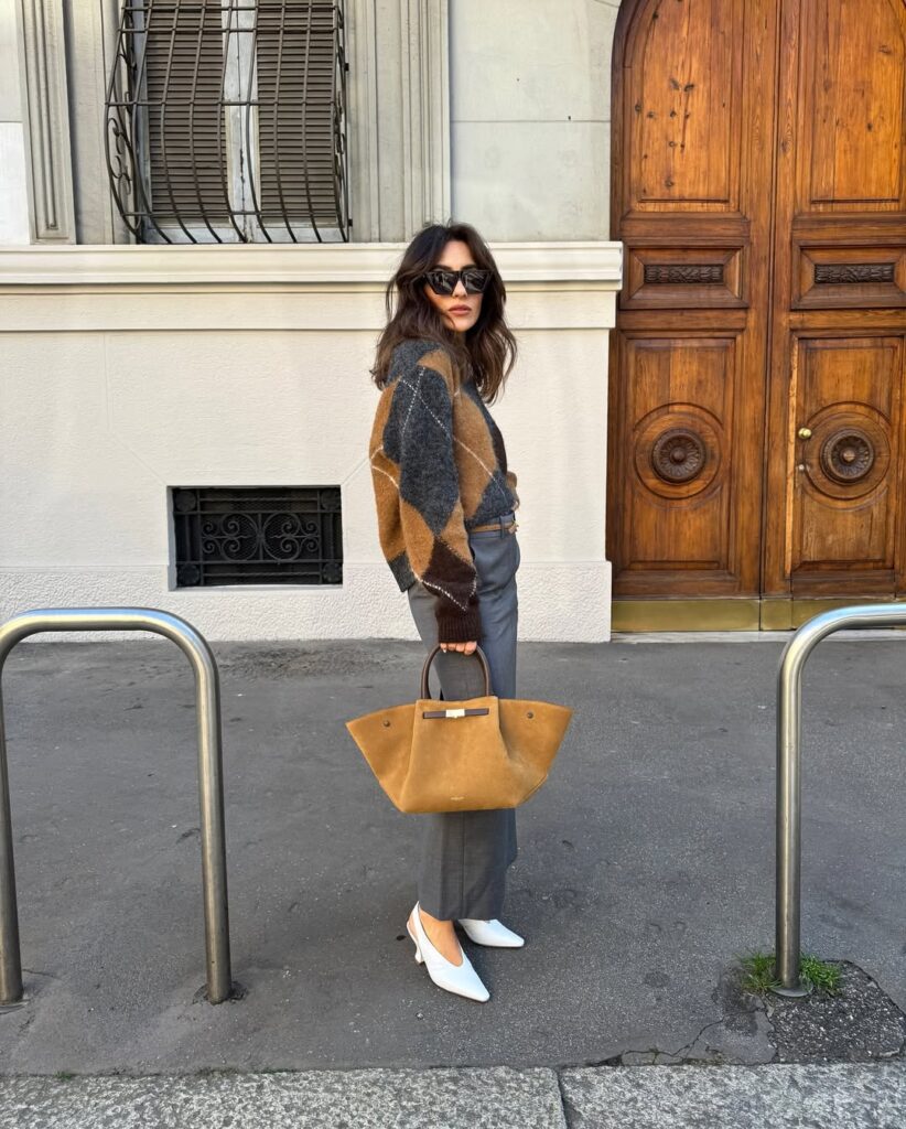 A cozy argyle wool sweater instantly adds texture and sophistication to your workwear rotation. When paired with tailored slate trousers, the look becomes both polished and warm, ideal for fall and winter office days. The blend of pattern and clean tailoring offers balance, making the outfit suitable for meetings, presentations, or any environment where you want to appear put-together yet approachable. Comfort is key here—the soft wool keeps you warm while the trousers maintain sharp, professional structure.
