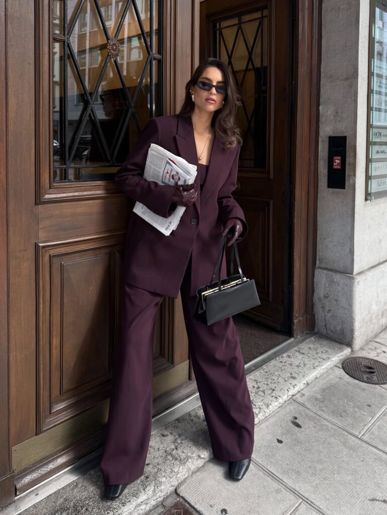 Bold and powerful, this oversized merlot suit makes a confident statement in any workplace. The rich color adds depth and personality, while noir accessories ground the look with sleek sophistication. This outfit is perfect for fashion-forward offices or days when you want to bring elevated energy and authority. Despite its boldness, the relaxed fit ensures comfort, blending trendiness with professional ease.
