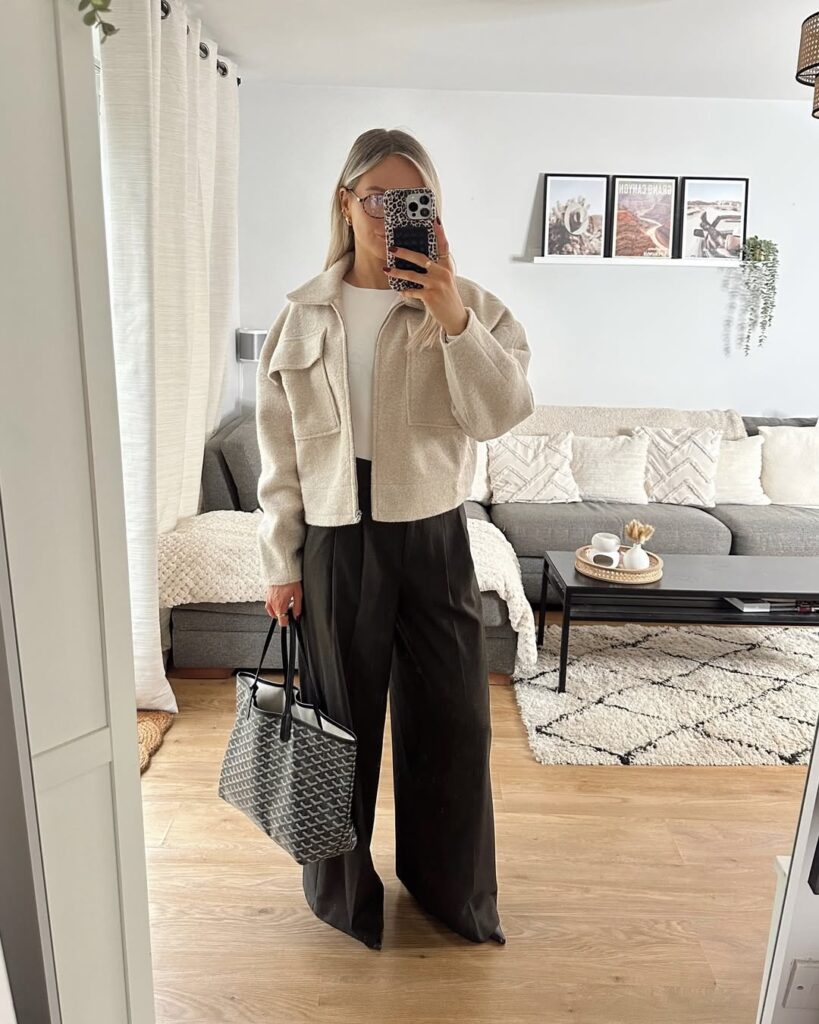 This look embodies timeless sophistication with its balanced proportions and deep neutral tones. The ivory cropped wool jacket introduces a clean, structured top half, while charcoal wide-leg trousers add movement and authority. Together, they form a refined ensemble perfect for corporate settings, presentations, or elevated office events. The wide-leg silhouette ensures all-day comfort, while the cropped jacket sharpens the overall shape, creating a dynamic yet classic feel.