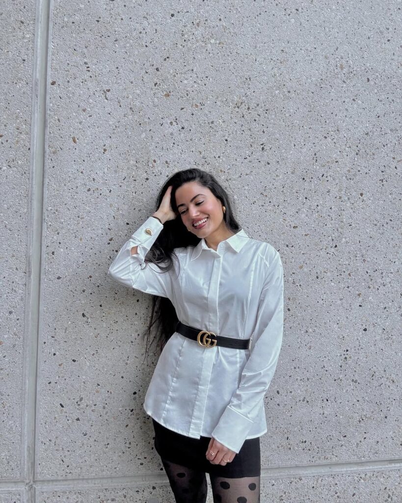 This outfit brings together timeless polish and contemporary structure, making it ideal for days when you want to look sharp without sacrificing comfort. The silky white shirt adds a luxurious, soft drape that feels light against the skin, while the belted mini introduces a tailored edge that remains workplace-appropriate when styled with refined accessories. It’s a great pick for creative offices, presentations, or after-work social plans, offering both style and versatility. The balance of softness and structure keeps it chic while allowing you to move comfortably throughout the day.