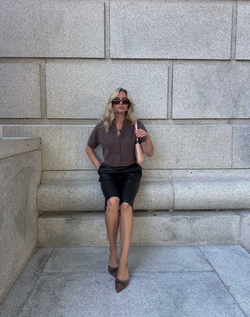 Soft neutrals meet tailored edge in this ultra-modern pairing. The muted mocha knit offers warmth and softness, creating a relaxed foundation, while sleek noir Bermudas introduce structure that feels fresh and contemporary. This outfit works beautifully for warm-weather offices or transitional seasons, offering an elegant balance between comfort and sophistication. The clean lines of the Bermudas keep the look sharp, while the knit adds an inviting, down-to-earth charm.
