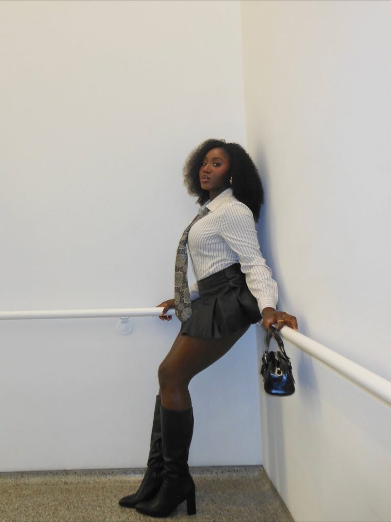 This look delivers sharp energy with its structured striped power shirt and a pleated mini that adds a youthful yet refined edge. The mix of vertical lines and tailored pleats creates a dynamic balance that’s perfect for modern workplaces or creative environments. It exudes intention — bold without being loud, playful without compromising professionalism. The mini introduces movement, while the shirt anchors the look with authority, making this an ideal office siren ensemble for transitional seasons.