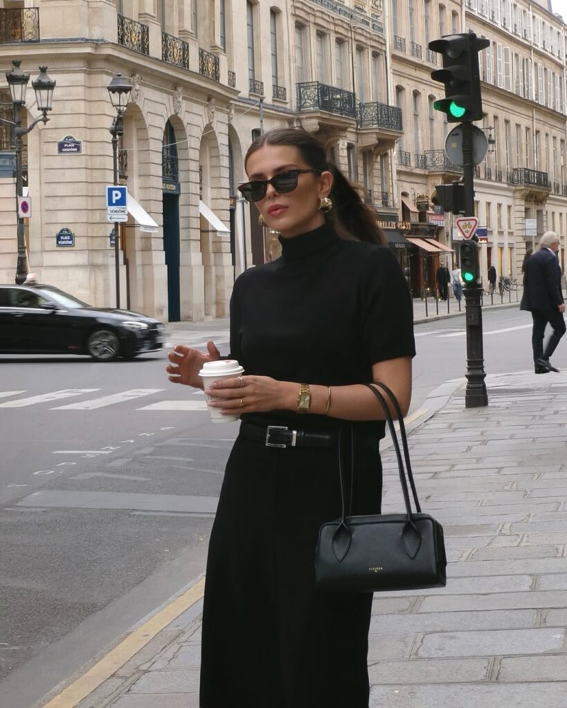 A black mock-neck is inherently sleek, and when paired with tailored trousers, it becomes a timeless office siren classic. This all-black ensemble elongates the silhouette and projects effortless authority. It’s particularly suited for high-focus days, presentations, or environments where you want your presence to feel grounded and composed. The look is powerful in its simplicity, proving that minimal dressing can be incredibly striking when done with intention.