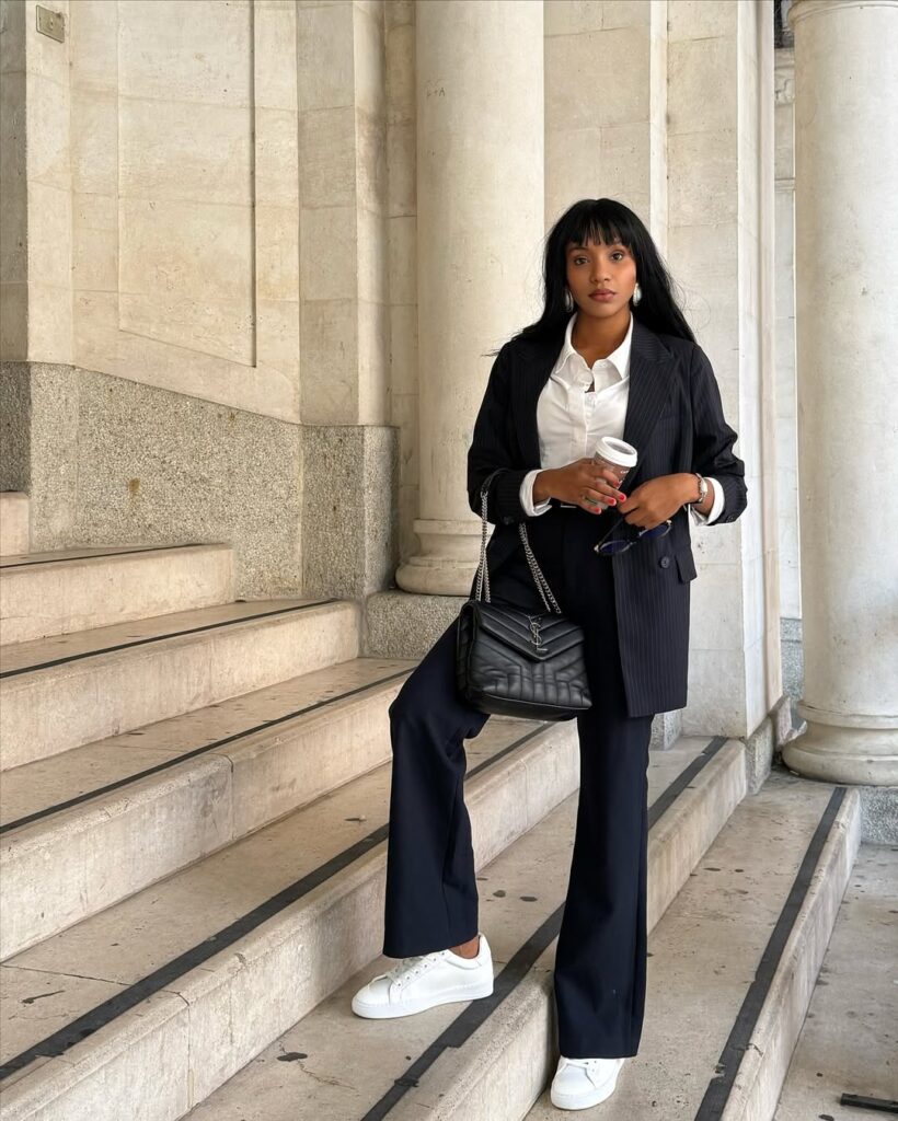 A pinstriped navy suit is a timeless power move, but when paired with crisp white layers, it becomes even more striking. The vertical lines elongate the frame, and the white underneath brightens the entire look. This ensemble is perfect for corporate settings, important meetings, or days when you want to reinforce your professional authority. With its flawless balance of structure and ease, it embodies the heart of office siren elegance: polished, sharp, and undeniably confident.