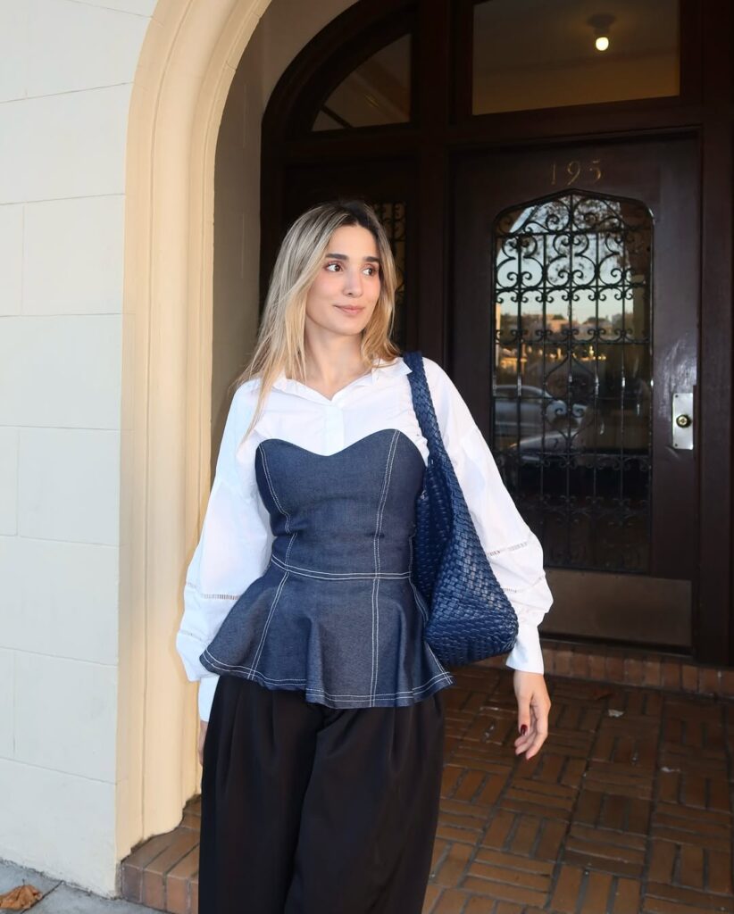 This outfit combines creativity with subtle structure, layering a denim peplum bustier over a bright white shirt for a fashion-forward take on office siren dressing. The peplum adds shape and movement, while the denim texture feels grounded and contemporary. This ensemble works beautifully in relaxed or creative workplaces where individuality is celebrated. The contrast between the structured shirt and artistic top creates a fresh, inspired look that remains polished enough for meetings and presentations.