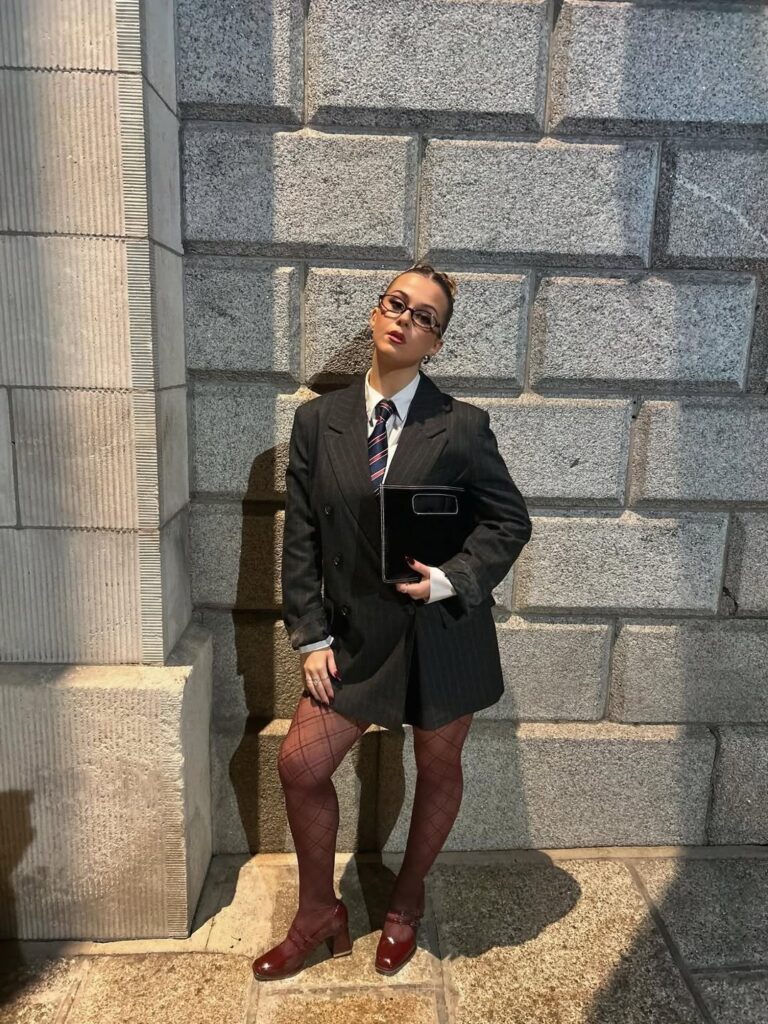 This outfit plays with contrast beautifully, pairing a structured pinstripe blazer dress with richly patterned burgundy tights. The result is both bold and polished, striking that balance between professional and expressive. Ideal for fall office days, fashion-forward workplaces, or after-hours events, this ensemble makes a memorable statement. The dress anchors the look in sophistication, while the tights add unexpected depth and texture, creating a refined siren-inspired moment.