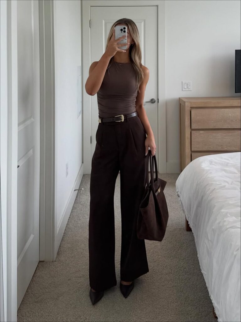 This combination offers subtle sophistication through soft ruching and rich espresso tailoring. The taupe tank adds gentle dimension, while the trousers ground the look in professionalism. Ideal for warm office days or minimalist dress codes, this outfit delivers a refined yet understated siren energy. The muted palette keeps it elegant, while the tailored structure ensures it remains polished enough for meetings, coworking sessions, or after-hours commitments.