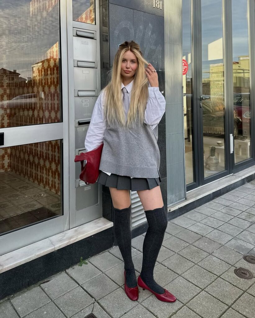 This ensemble merges classic tailoring with playful proportions. The pleated grey mini offers movement and charm, while the structured blazer adds authority and balance. Together, they create a polished yet youthful office siren look perfect for hybrid offices, modern corporate settings, or team-focused days. The combination of structure and flow creates an outfit that is both commanding and approachable, making it a versatile weekday favorite.