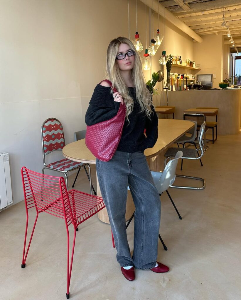 An off-shoulder knit brings tasteful allure to this casual-chic ensemble, while washed wide-leg denim creates a laid-back yet polished profile. This outfit works best in relaxed office environments or creative roles where expressive dressing is the norm. It blends femininity with effortless cool, creating a siren-inspired silhouette that feels approachable yet elevated. The combination of soft textures and flowing lines makes it ideal for long workdays or casual team meetups.