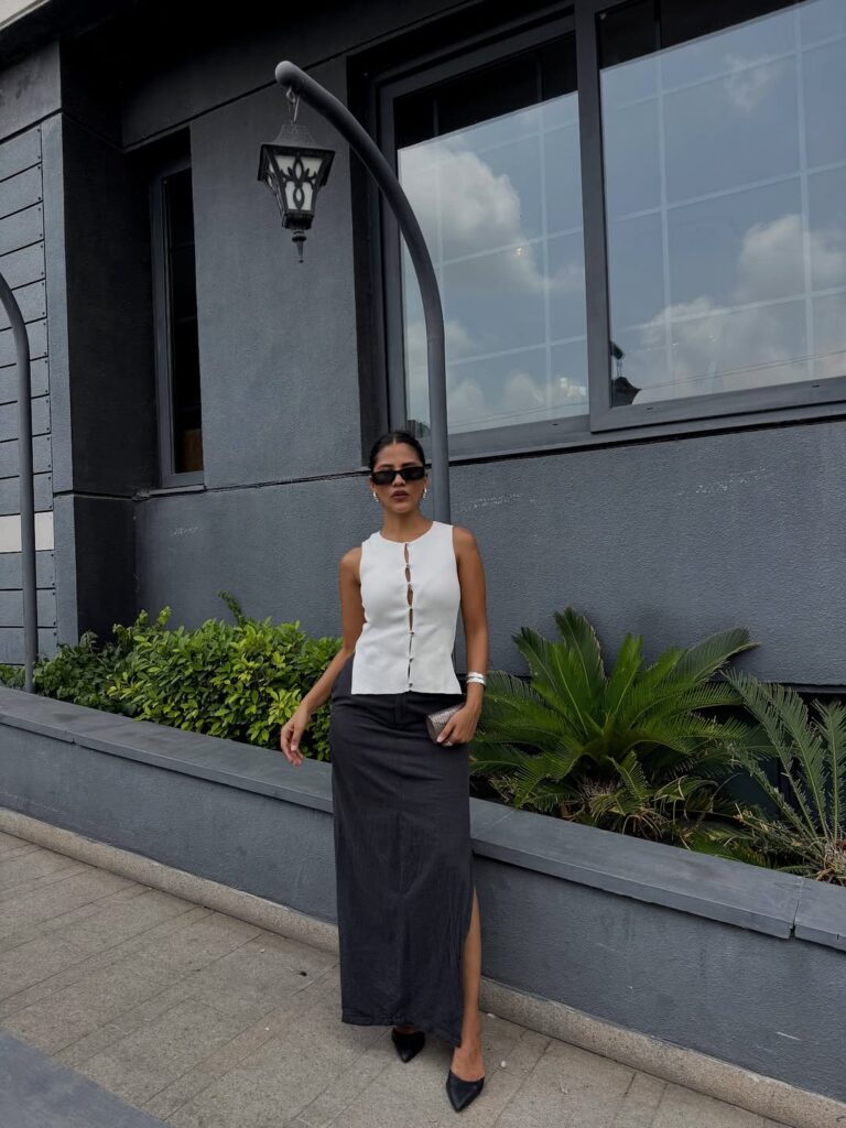 This combination feels effortlessly elegant, merging the sharp cleanliness of an ivory vest with the elongating effect of a charcoal column skirt. The vest brings a tailored, modern edge, while the skirt offers refined movement suitable for any professional environment. Together, they create a monochromatic-inspired palette that exudes calm, capability, and quiet luxury. Ideal for warm office days or creative roles, this outfit keeps you cool while maintaining a commanding presence.