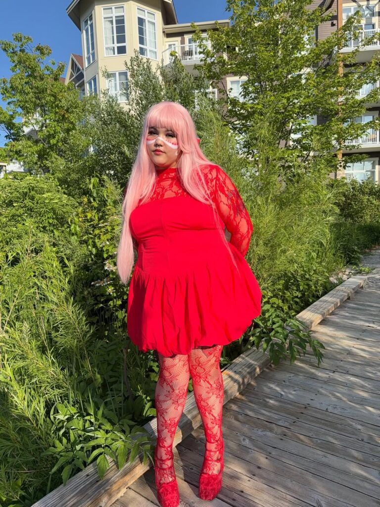 This bright and romantic ensemble channels classic anime-girl charm with gothic undertones. The scarlet lace mini dress offers texture and movement while rosette tights introduce whimsical detail. Together, they create a bold silhouette perfect for sweet-but-fiery characters. Its lightweight feel makes it easy to wear for long periods, whether at photoshoots, indoor conventions, or themed parties. This outfit balances playful color with beautifully intricate patterns.