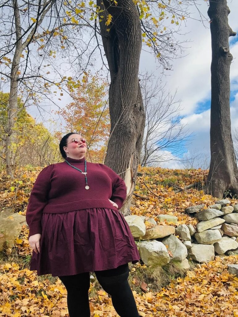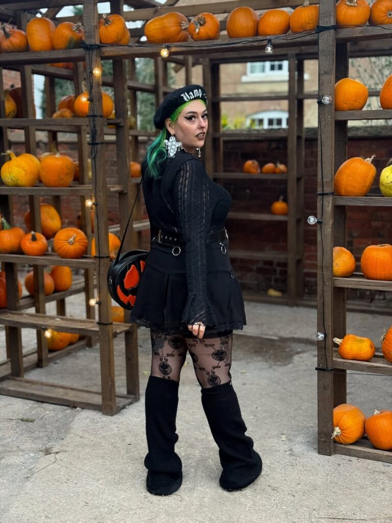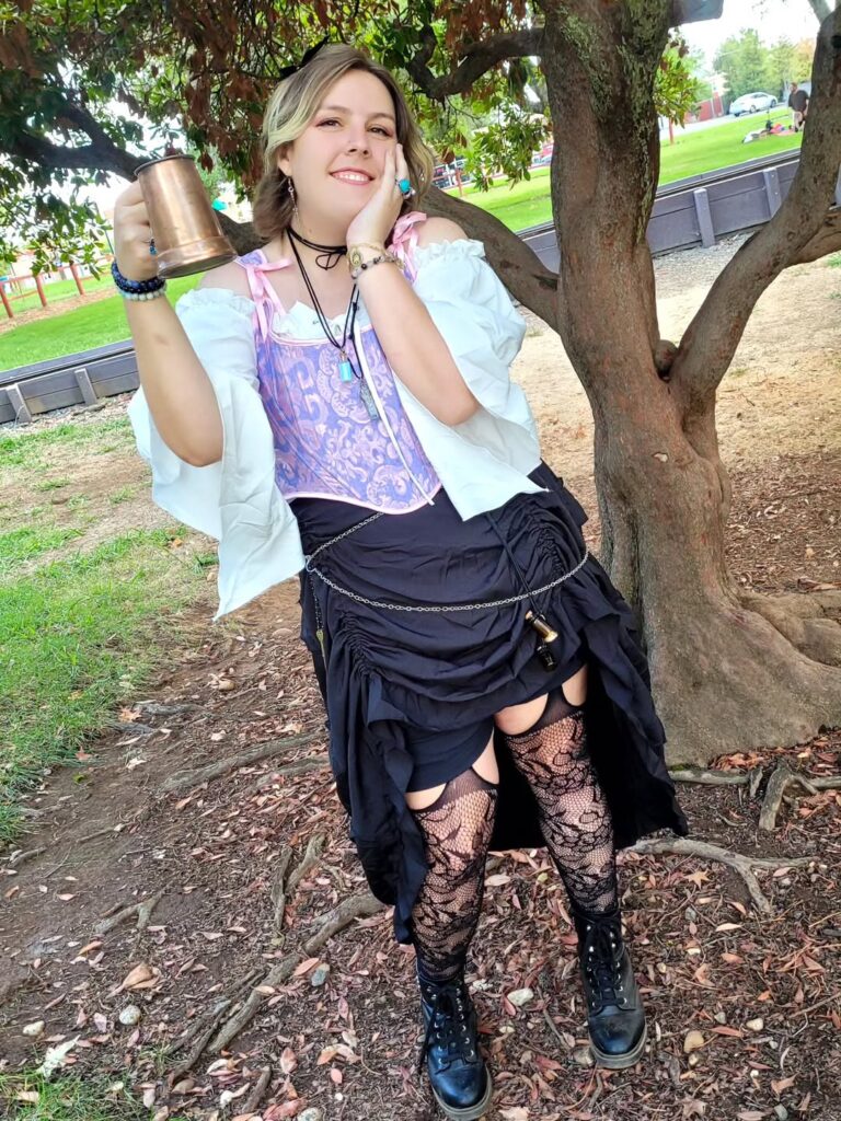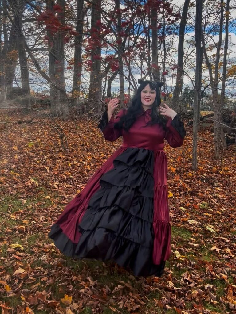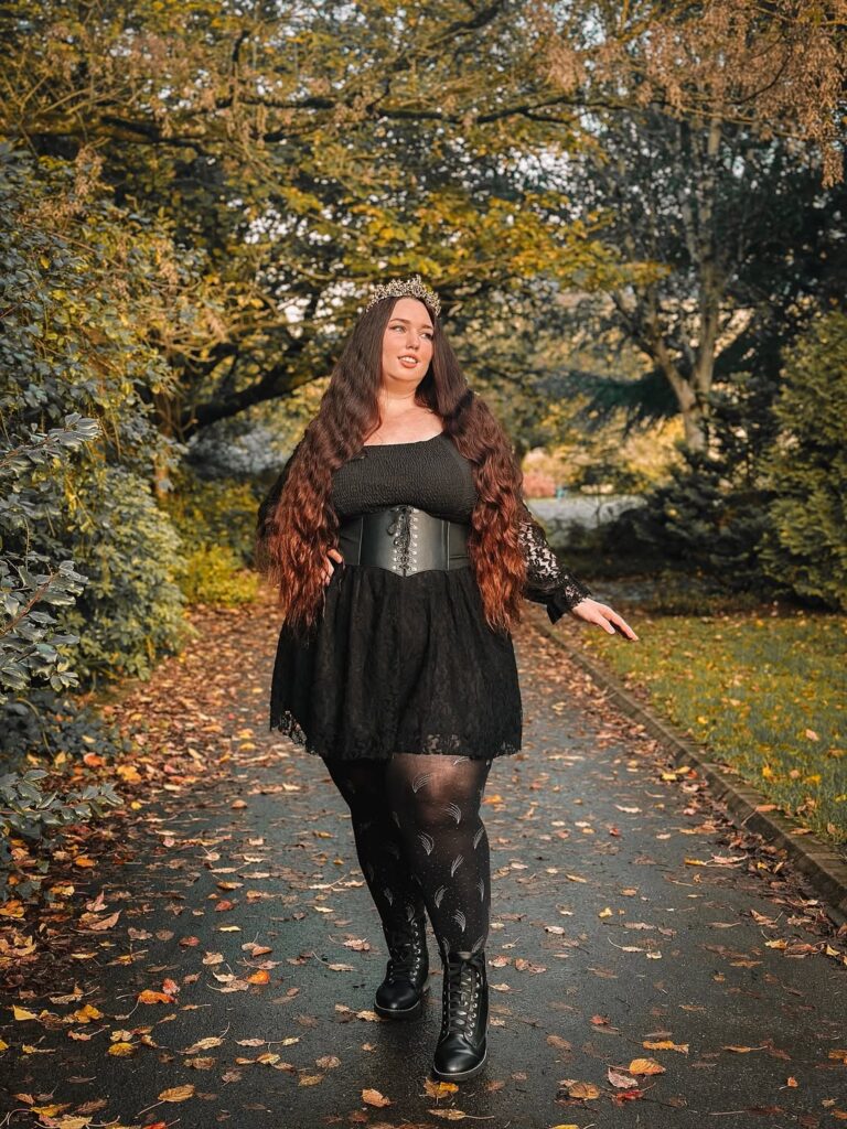 Warm, soft, and effortlessly stylish, this outfit leans into cozy gothic vibes with a rich burgundy sweater dress and deep midnight tights. It’s ideal for autumn events, indoor conventions, or characters inspired by dark academia. The sweater dress drapes comfortably without losing shape, and the overall look photographs well in warm or low lighting. Its simplicity makes it adaptable while still feeling polished.