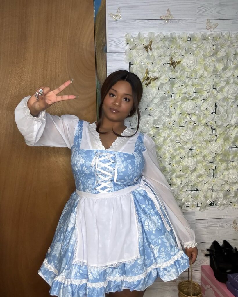 This soft and romantic look channels alpine elegance with cosplay flair. The powder-blue dirndl shape flatters the waist while the floral details add sweetness. Sheer poet sleeves introduce whimsical movement, making this ideal for fairytale characters, fantasy villages, or festival-themed events. The outfit blends structure with softness, giving you comfort and beauty in equal measure.