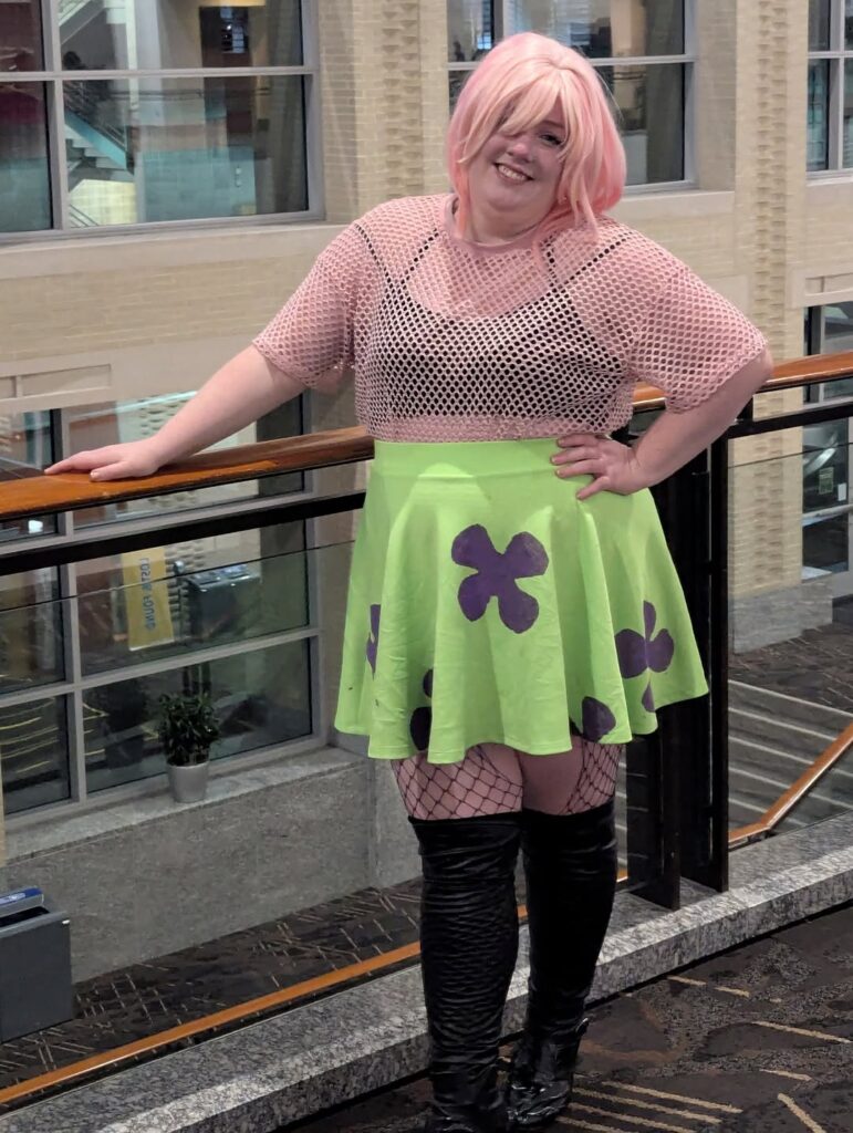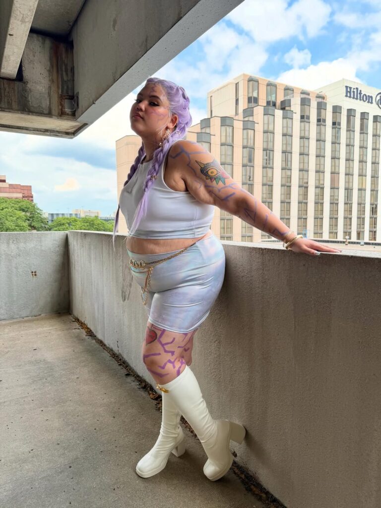 Vibrant and playful, this cyber-inspired outfit showcases bold neon colors and dynamic textures. The clover-pattern skirt pairs strikingly with a pink mesh crop top, creating a futuristic, energetic silhouette. Thigh-high textured accessories bring the look together with dramatic flair. This outfit works especially well for rave-style characters, magical-girl reinterpretations, or dance-themed cosplays. Despite the boldness, its lightweight fabrics keep everything comfortable and breathable.
