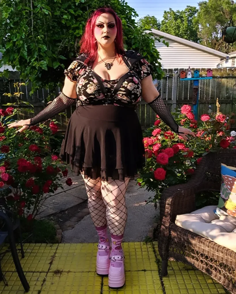 This outfit blends floral romance with gothic attitude, creating a striking dual-aesthetic look. The mini dress features intricate patterns that pair dramatically with fishnet sleeves, giving you texture, contrast, and edge. Perfect for dark fairies, gothic princesses, or magical rebels, the ensemble allows for flexible movement and expressive styling. Despite its bold details, it remains lightweight and wearable for extended periods.