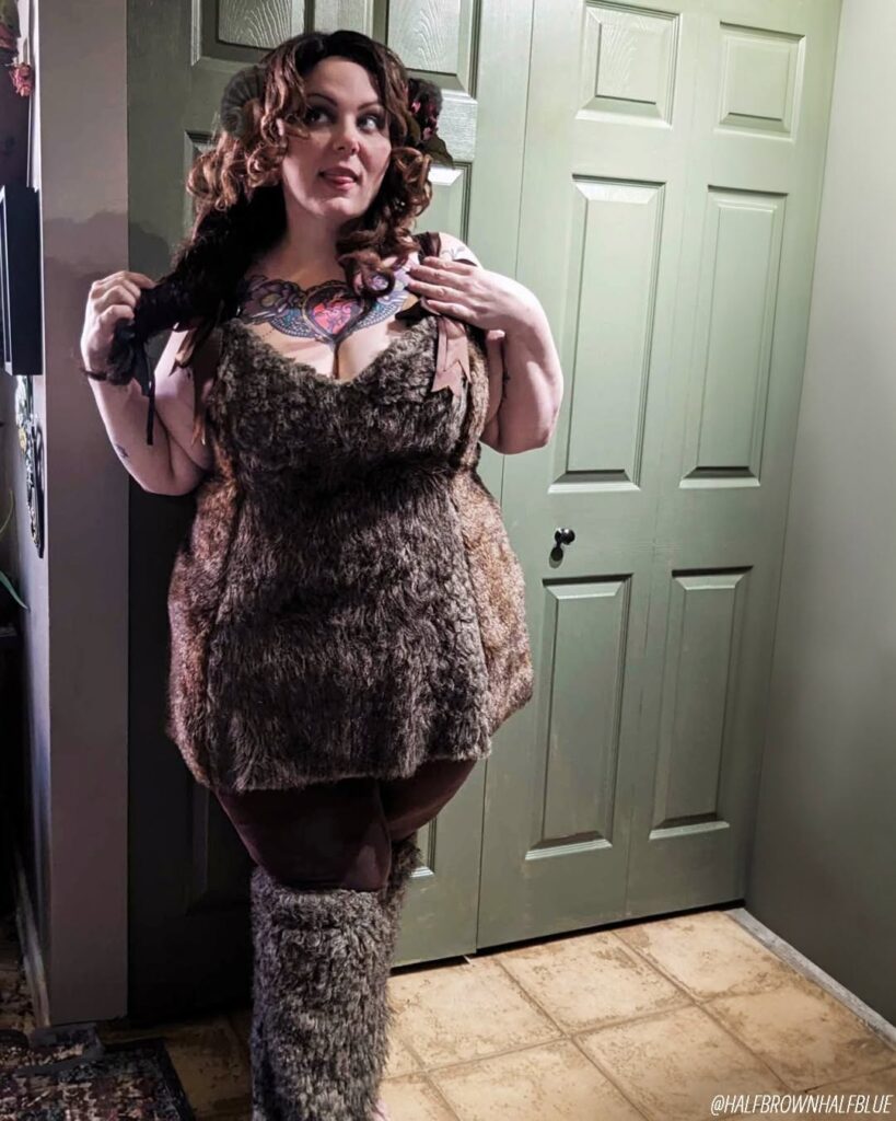 A nature-inspired outfit brimming with woodland fantasy charm, this ensemble pairs faux-fur elements with earthy fabrics. Textured leg warmers add cozy detail while enhancing the forest-dweller aesthetic. Ideal for fairies, druids, or whimsical creatures, this look is comfortable for outdoor shoots and fairs. Its layered design provides warmth while ensuring flexibility, giving you a character that feels grounded and magical at the same time.