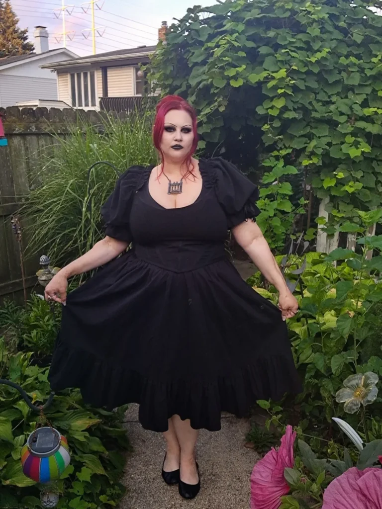 This outfit embodies gothic romance, featuring puff sleeves that add drama and velvet accents that elevate the texture. The midi length offers comfort and mobility, making it practical for conventions, stage performances, or moody character portrayals. The structured bodice and soft skirt create a flattering silhouette that feels timeless and expressive. This look is perfect for vampires, witches, or original characters who blend elegance with darkness.