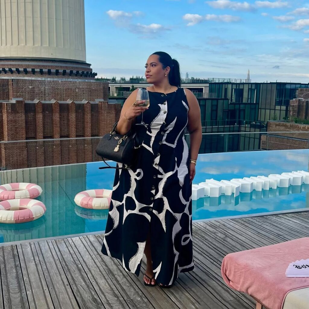 This monochrome button-front maxi dress highlights modern simplicity with a touch of artistic flair. The abstract pattern adds interest while maintaining a refined look. Its full-length silhouette flows naturally, offering both comfort and visual impact. The button-front design adds structure and versatility, making it adaptable to different prom themes. Soft fabric movement ensures all-night comfort, making it ideal for someone who appreciates minimalist style with a sophisticated twist.