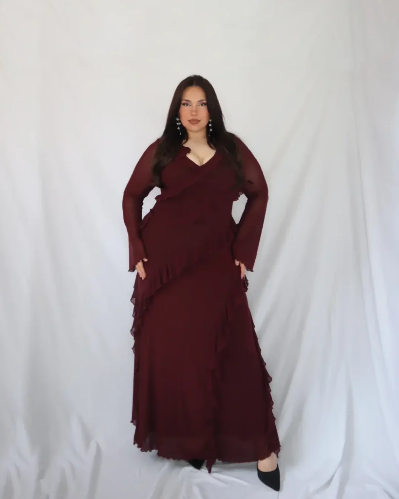 This garnet chiffon gown channels romantic energy with its flowing ruffle trim that adds movement without overwhelming the shape. The airy fabric glides gracefully with every step, making it ideal for dancing, entrances, and prom photos. Its full-length silhouette creates elongation, while the ruffle accents soften the overall look, adding a dreamy finish. Perfect for anyone wanting a blend of elegance and comfort, the gown’s lightweight feel ensures you stay cool and confident throughout the night. It’s a statement piece that remains effortlessly wearable.