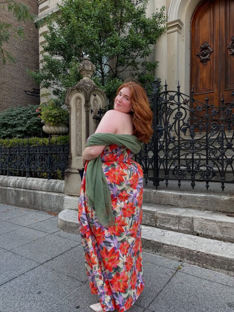 This tropical-inspired maxi embodies vibrant energy with its bold florals and fluid drape. Paired with a matching shawl, the look feels lush and full of movement, perfect for outdoor or summer-themed proms. The maxi silhouette elongates the figure while keeping comfort top priority. The added shawl drapes softly over the shoulders, offering versatility and extra elegance. With its rich colors and relaxed fit, this outfit is ideal for someone who wants a statement look that’s easy to wear throughout the night.