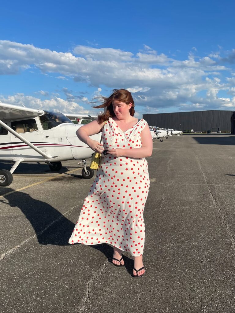 6. Ivory Satin Maxi with Scarlet Polka Dots