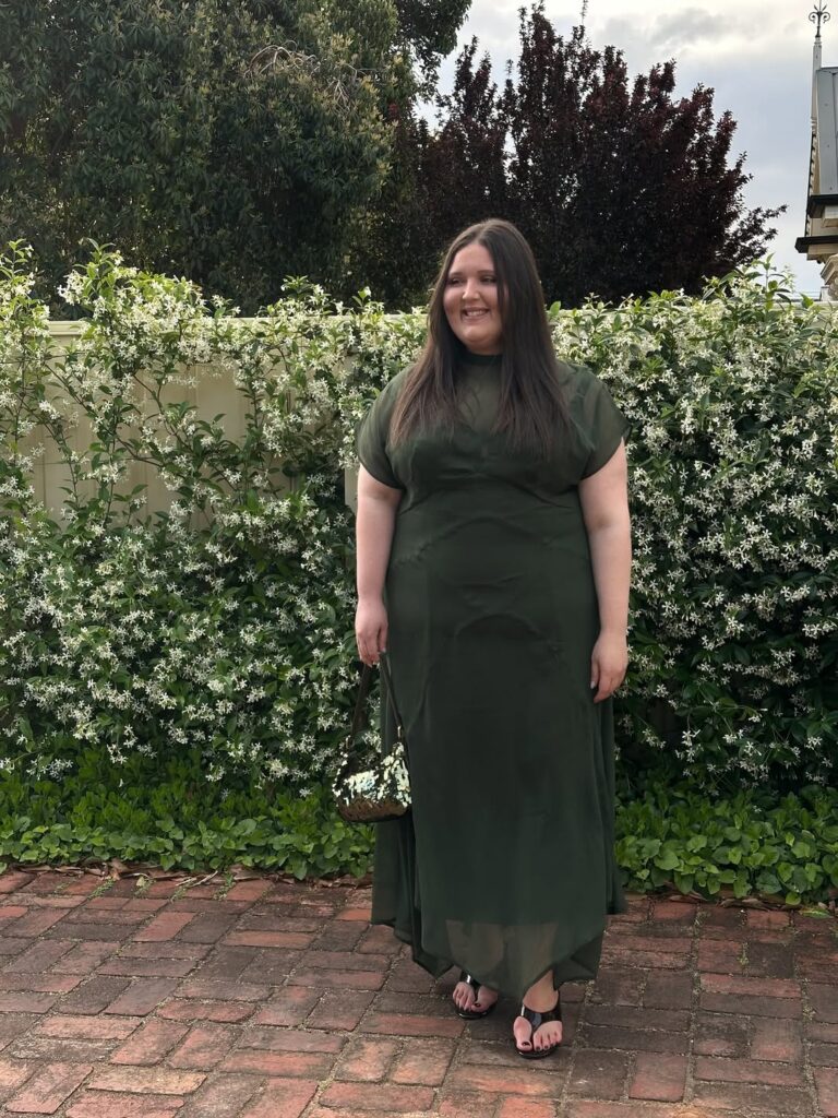 This forest-toned chiffon maxi offers ethereal elegance with its sheer layers and soft, sweeping silhouette. The lightweight fabric moves beautifully, while the metallic accent bag adds a hint of contemporary glamour. Perfect for evening proms or nature-inspired themes, this outfit blends ease, style, and subtle shimmer. The airy design ensures comfort throughout the night, and the tonal richness creates a refined, photo-friendly finish. It’s an excellent choice for someone who loves softness with a polished touch.