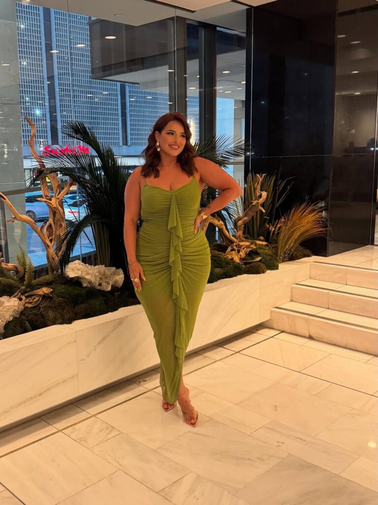 13. Olive Ruched Column Dress with Cascading Front Ruffle