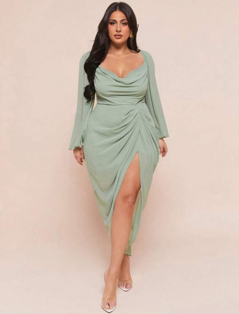 This sage midi dress offers a beautifully balanced prom look with its soft draping and sculpted ruching that contours the figure without feeling restrictive. The gathered details along the side create gentle movement and a naturally flattering silhouette that suits both formal and semi-formal settings. Its mid-length makes it perfect for those who want a sophisticated look without the drama of a full gown. The breathable fabric ensures comfort throughout the night, while the understated elegance makes it a timeless prom choice that photographs beautifully.
