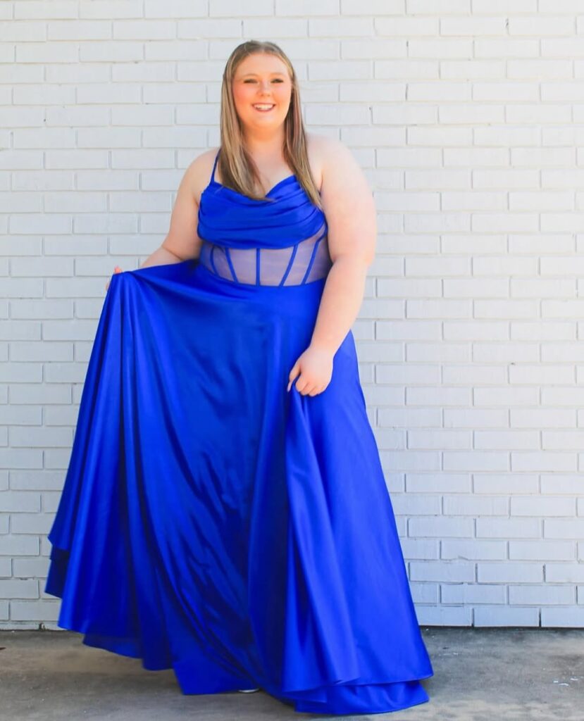 This showstopping royal-toned ball gown elevates prom night with its dramatic volume and elegant cowl neck. The sheer corset bodice adds structure and visual interest while still feeling lightweight. The full skirt brings the fairytale effect many prom-goers love, yet the fluid fabric keeps the gown comfortable during movement. Perfect for grand entrances, this look blends regal charm with modern detailing. It’s ideal for anyone who wants a dramatic silhouette without sacrificing breathability or comfort.