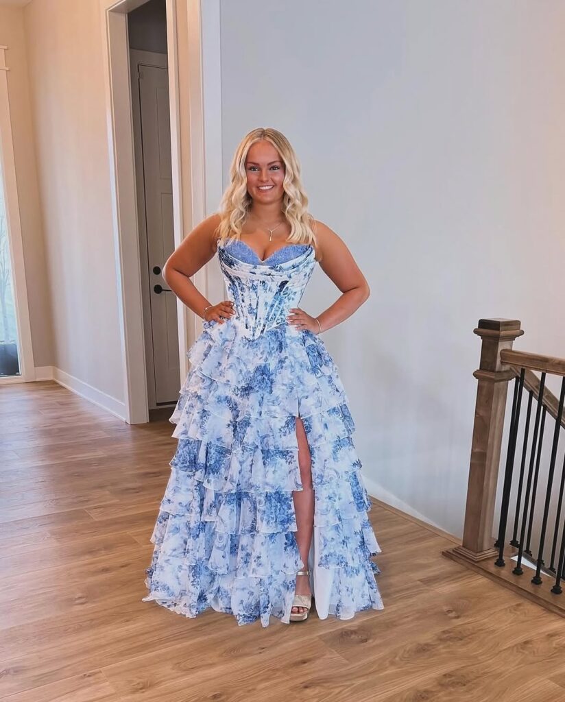 This toile-print corset gown blends classic elegance with whimsical detailing. The structured bodice enhances the silhouette, while the tiered ruffle skirt adds romance and movement. The delicate print offers a vintage-inspired charm that feels both dreamy and sophisticated. This gown is ideal for someone who loves storybook or historical fashion elements but still wants a comfortable fit. The ruffles cascade beautifully, making every step feel graceful and photo-ready.