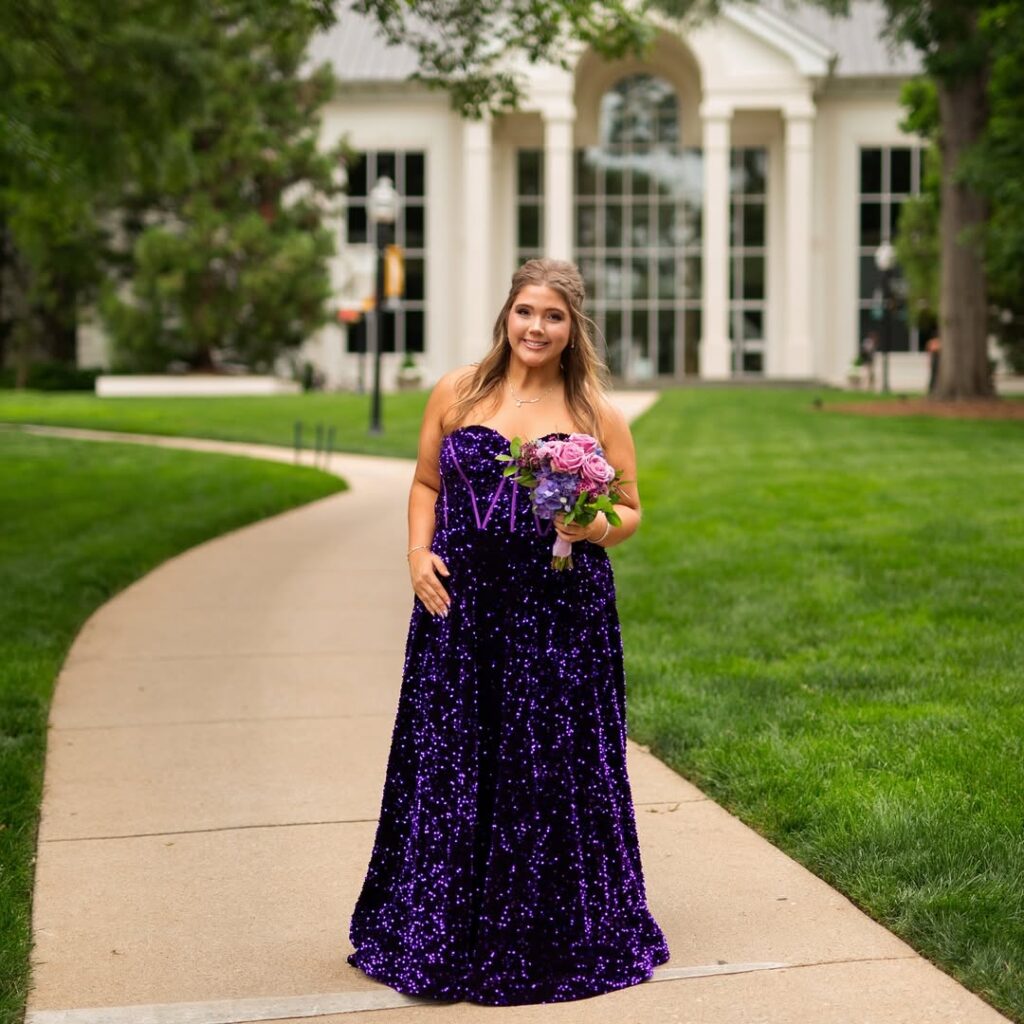 This violet ball gown offers full glamour with its all-over sequins and romantic sweetheart neckline. The sparkling finish gives the dress a luminous quality that’s perfect for evening proms or high-glam themes. The structured bodice provides support, while the voluminous skirt creates dramatic movement without feeling heavy. It combines fantasy and comfort beautifully, making it ideal for someone who wants a dazzling yet wearable prom option. The rich violet color further enhances its luxurious impact.