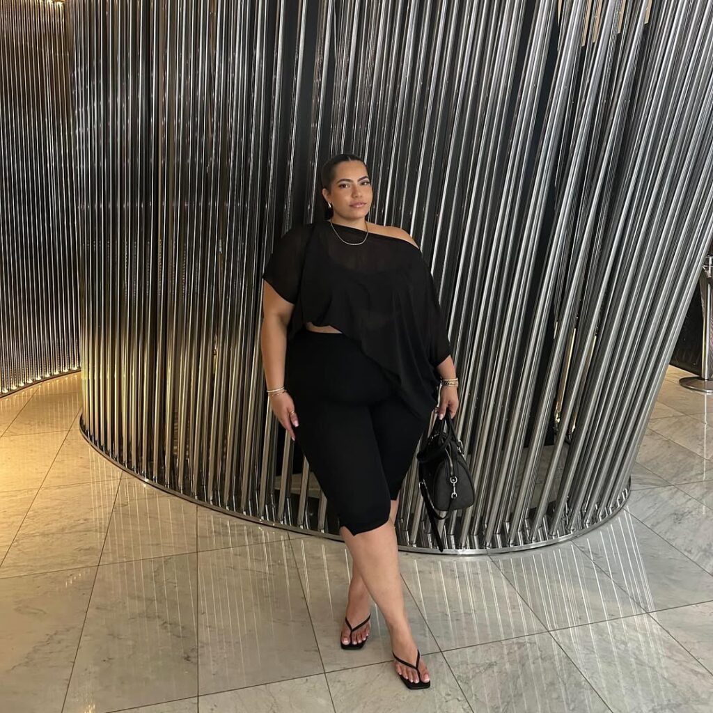 18. Asymmetrical Sheer Top with Sleek Black Bermuda Ensemble
