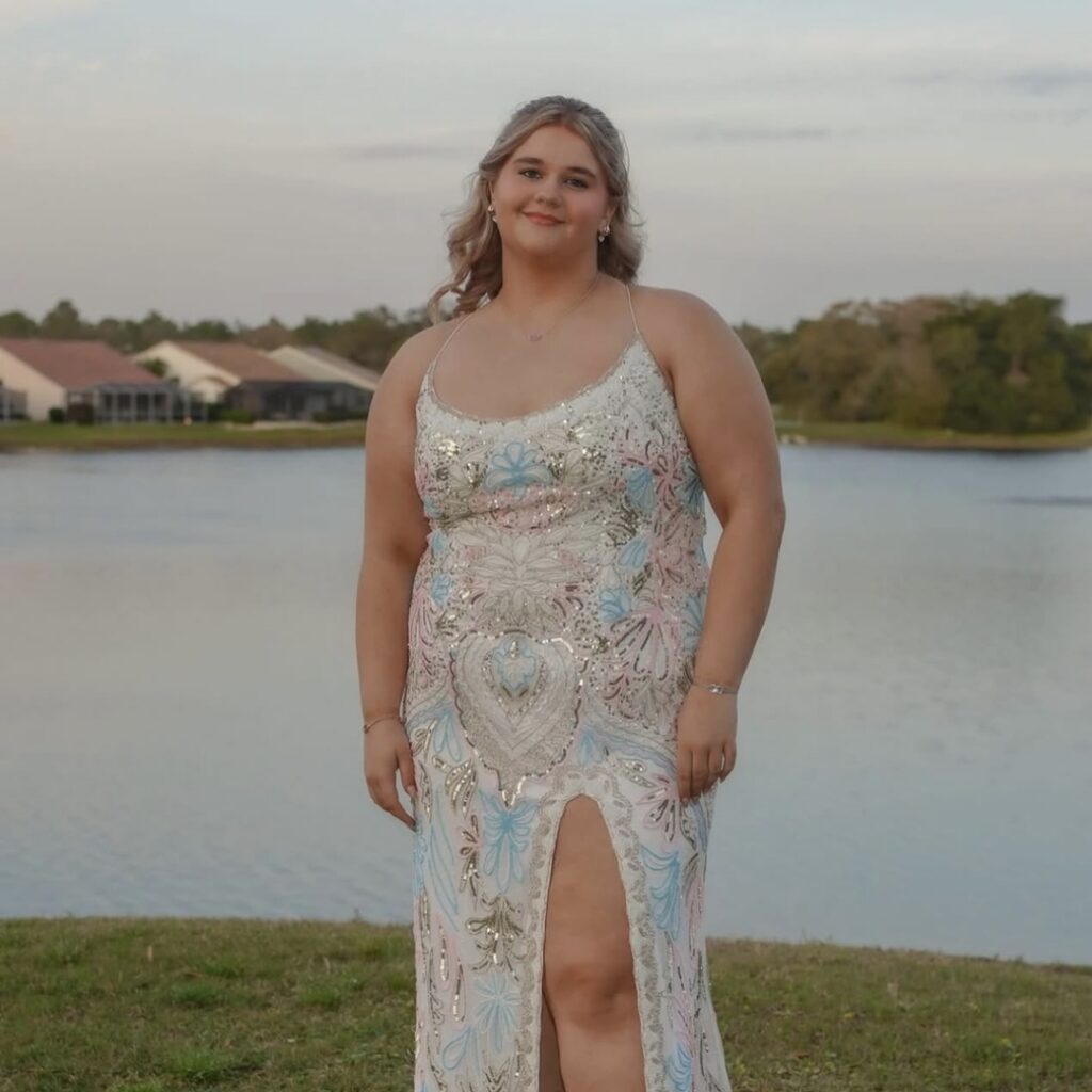 This iridescent beaded gown is the epitome of prom-night glamour, featuring intricate floral beading that catches the light from every angle. The front slit gives it a modern, red-carpet edge while still maintaining an elegant flow. The structured bodice provides support, while the skirt’s soft movement ensures comfort and grace. Ideal for grand prom themes or ballroom-inspired venues, this gown delivers both sparkle and sophistication. Its combination of embellishment and ease makes it perfect for someone who wants to shine without sacrificing comfort.