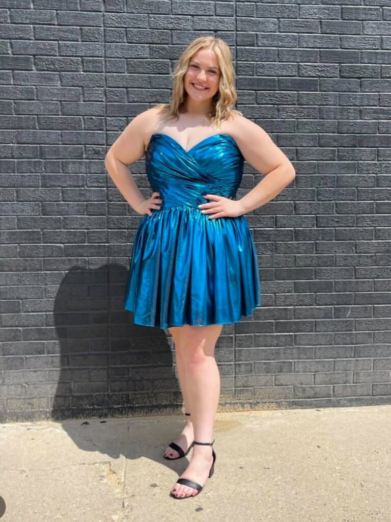 This strapless mini dress in teal shimmer is playful, bold, and perfect for those who prefer a shorter prom look. The ruched bodice enhances shape while maintaining flexibility and comfort. The shimmering fabric creates a standout effect under event lighting, making every moment sparkle. This mini dress is ideal for dancing, socializing, and capturing fun prom photos. Despite its shorter length, it still carries a sense of elegance thanks to its sculpted structure and modern finish.