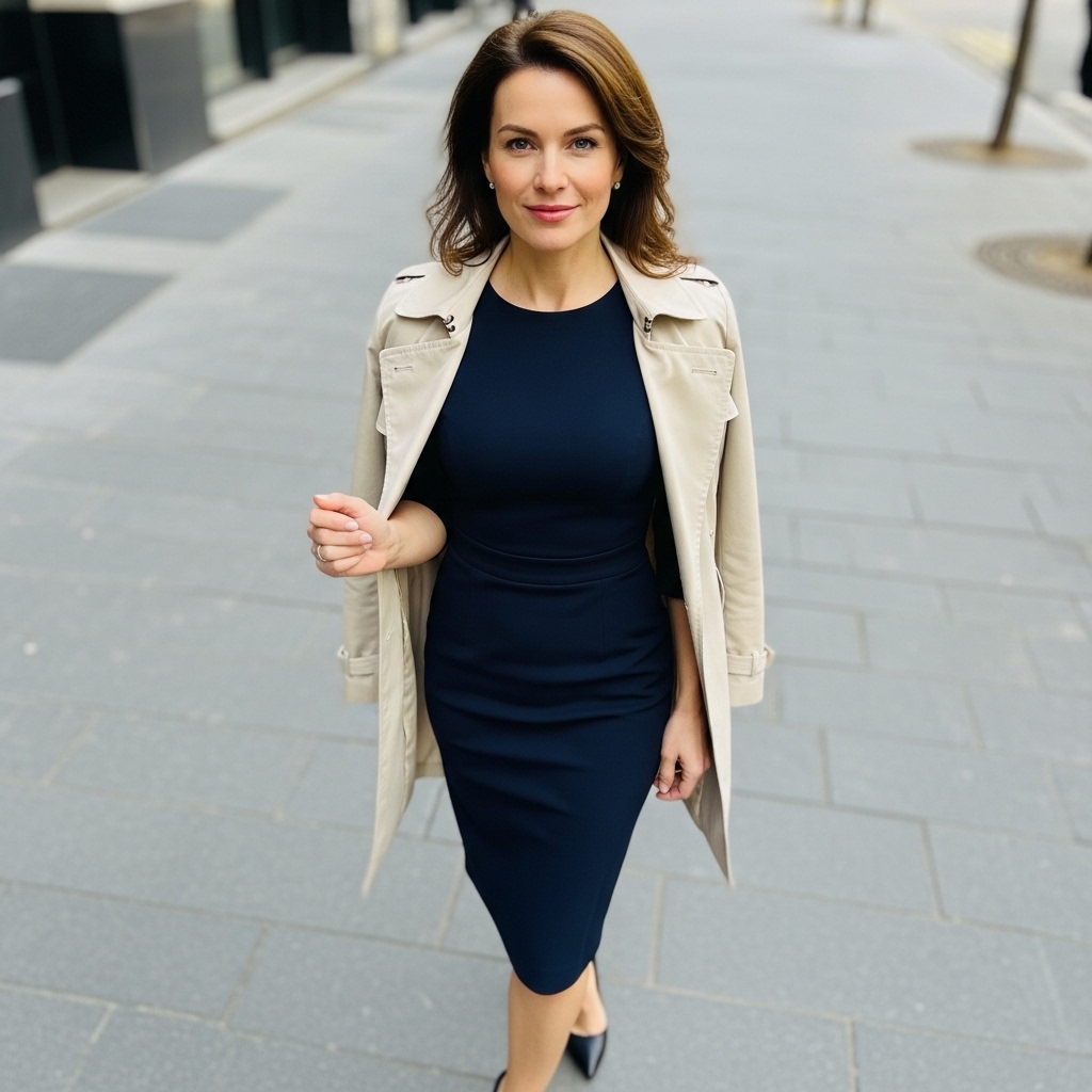 For a refined office look, a sheath dress paired with a trench coat is perfect. Stick to darker hues for the dress, like navy or charcoal, and a classic beige trench on top. Add minimal jewelry and pumps for the ultimate professional statement. This outfit feels powerful yet elegant and is especially perfect for presentations or formal business meetings during fall weather.