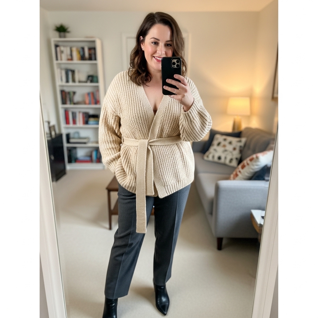 A belted cardigan transforms into a structured, office-friendly piece. Layer it over tailored trousers and a fitted blouse for balance. Add pointed-toe shoes or sleek ankle boots to keep the outfit polished. Opt for soft fall hues like cream, tan, or muted green. This outfit offers both coziness and professionalism—ideal for those chilly fall mornings when you still need a sharp, put-together appearance.