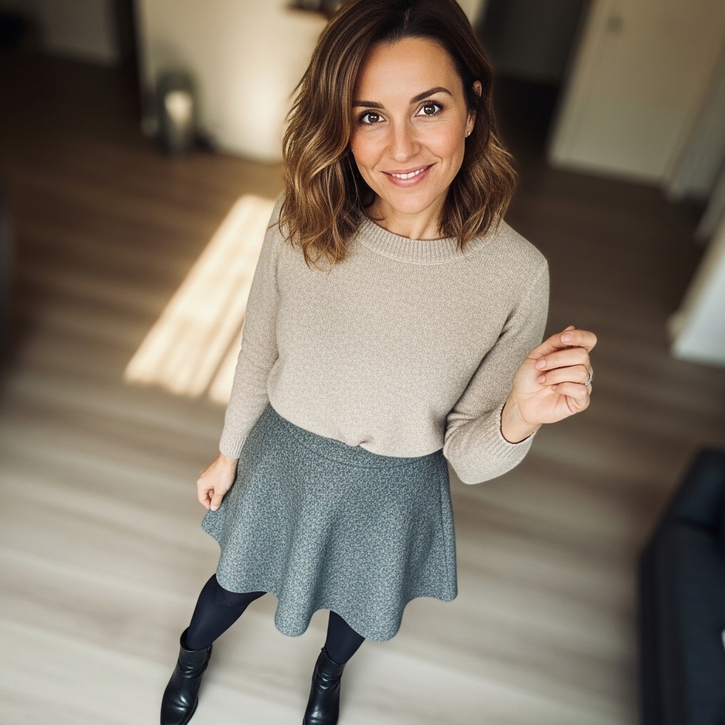 A wool skirt paired with a soft cashmere sweater offers cozy professionalism. Choose a-line or pencil skirts in muted tones like grey or brown. Tuck in the sweater slightly to maintain structure. Add tights and polished boots to complete the look. This outfit balances warmth with elegance, making it an excellent choice for colder fall days when comfort and style must go hand in hand.