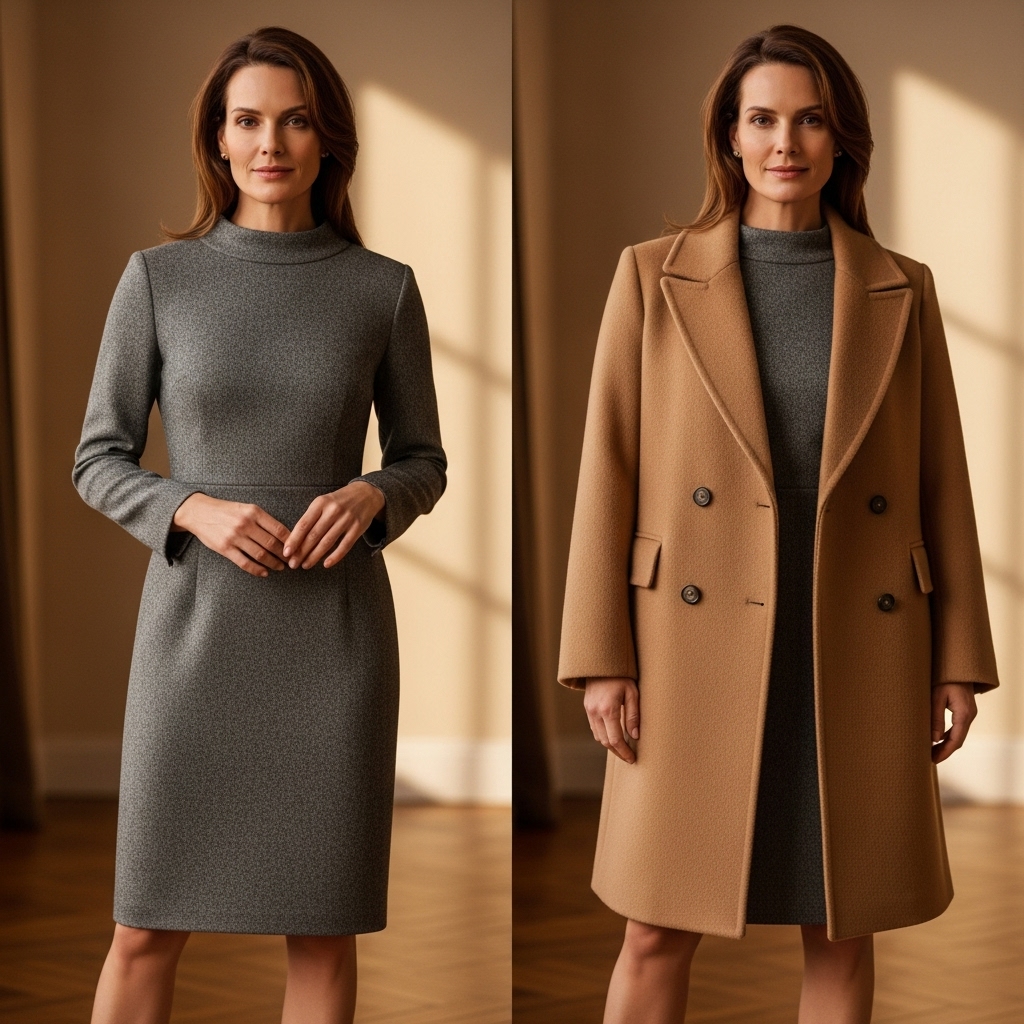 A double-breasted coat instantly elevates a simple work dress. Choose a structured coat in plaid, navy, or camel for fall. Pair with black tights and classic pumps for polish. This combination creates a commanding yet elegant presence. Perfect for cold fall mornings when you need both warmth and professionalism. It’s one of the best investment looks for any working woman’s fall wardrobe.