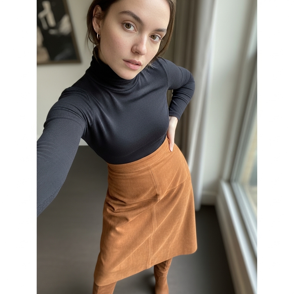 A fitted turtleneck tucked into a midi skirt creates a flattering, sleek look that transitions easily from desk to dinner. Choose fall textures like suede or wool for the skirt and keep your turtleneck in neutral tones. Pair with heeled boots and a structured handbag for a balanced outfit that’s professional yet stylish. This is a perfect blend of feminine and office-appropriate fashion.