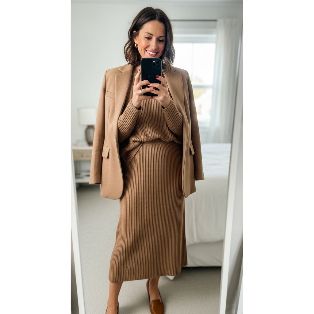 Matching knit sets are a stylish, cozy option for professional settings. Choose a ribbed skirt and top set in fall hues like camel or burgundy, layered with a structured blazer. Add pumps or loafers to complete the polished vibe. The coordinated look feels intentional and refined while offering comfort. This outfit is an effortless solution when you want to look stylish without overthinking your fall office wardrobe.