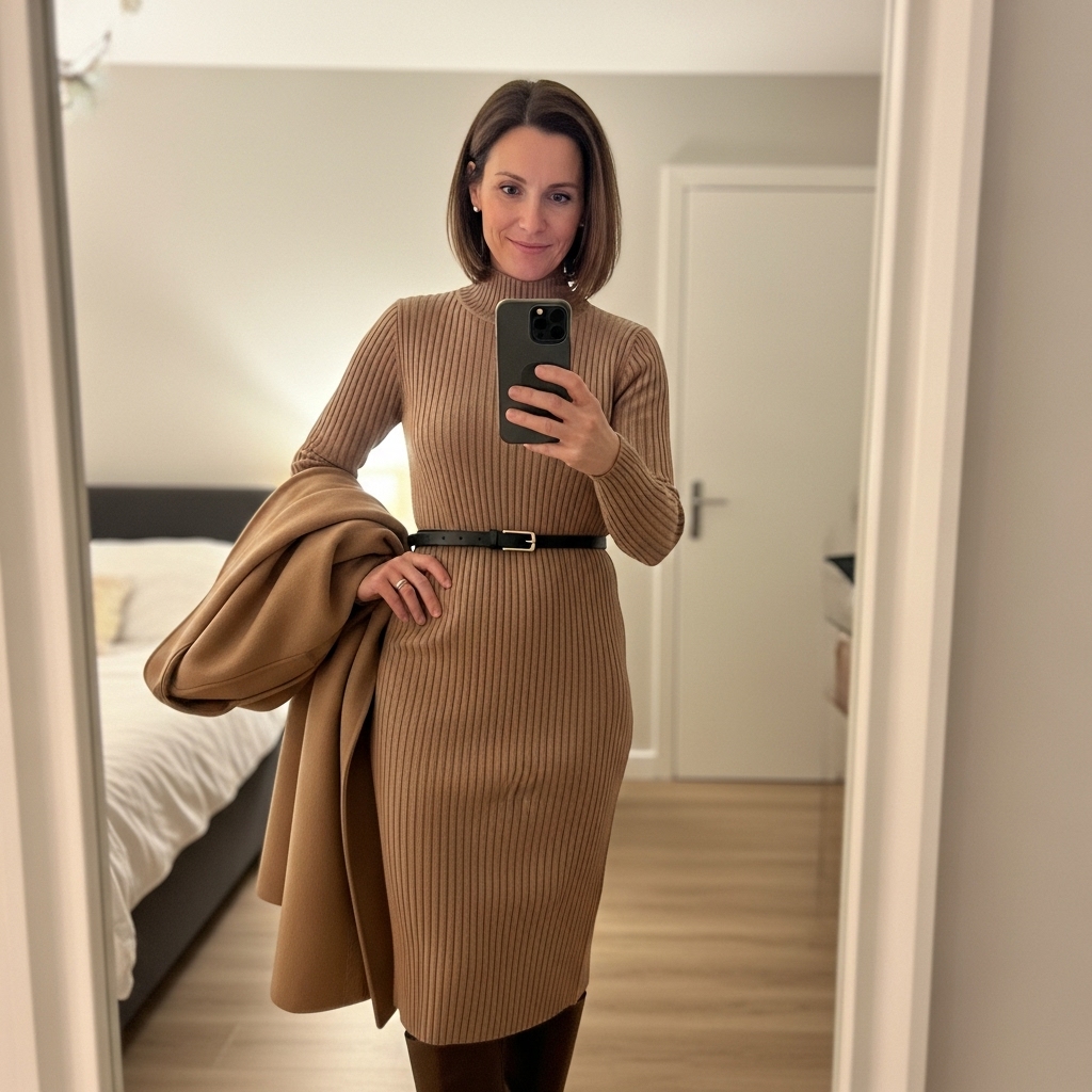 A knit dress offers both comfort and elegance during fall. Cinching it with a slim belt defines your waist while keeping the outfit work-ready. Choose earth tones like olive or camel and pair them with tall boots. Add a tailored coat for cooler mornings, and you’ll have a professional look that feels effortlessly put together. It’s also versatile for casual Fridays at the office.