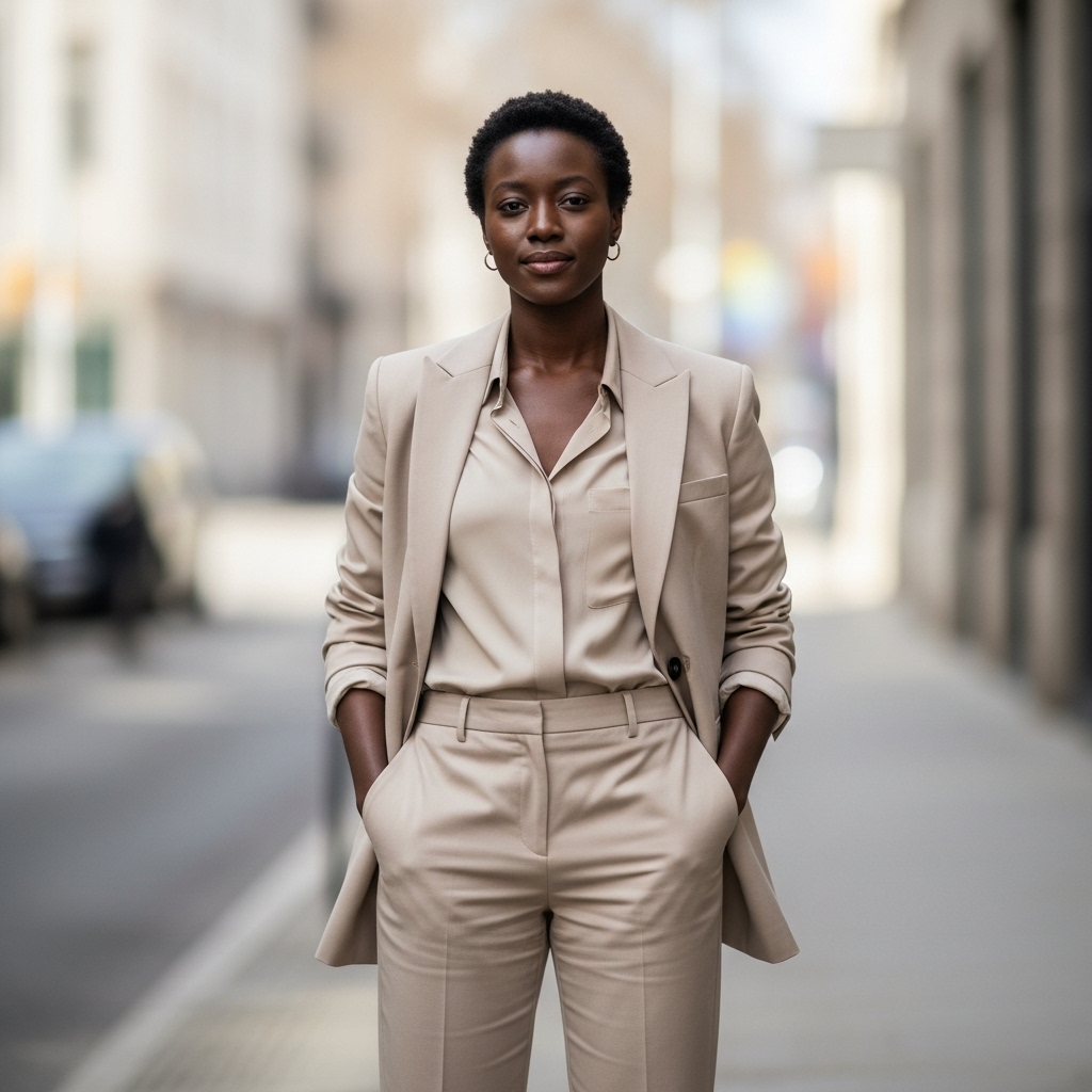 Monochrome suits never go out of style. Opt for beige, ivory, or soft grey to keep the palette seasonal and chic. Pair with a matching blazer and trousers, adding a silky blouse underneath. Neutral monochrome looks exude confidence while still being minimal and elegant. Complete with nude pumps and a leather tote bag, making this look a fall staple for any professional wardrobe.