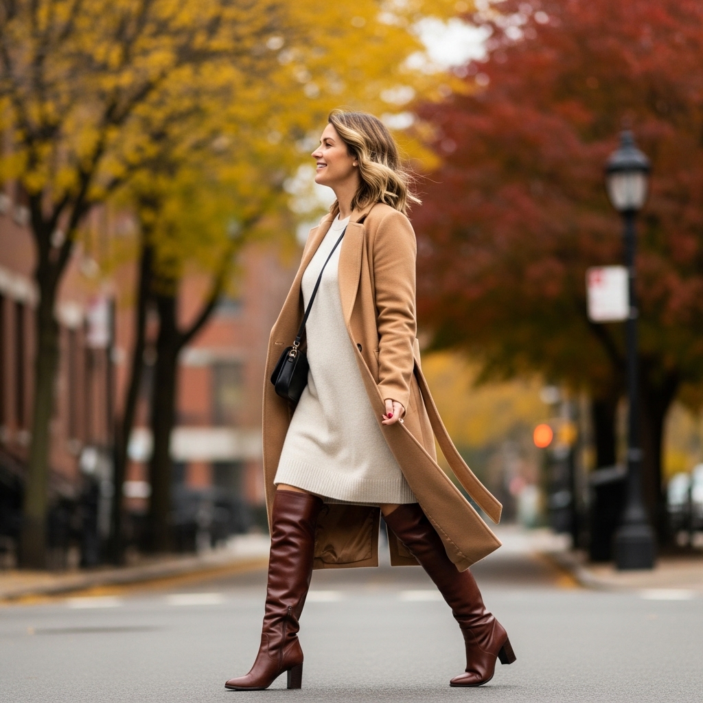 A sweater dress is cozy yet chic for fall. Add polish with a longline coat in a complementary shade such as camel or navy. Wear with knee-high boots for a balanced silhouette. The softness of the sweater contrasts perfectly with the sharpness of the coat, creating a professional yet approachable vibe. This outfit transitions seamlessly from a casual workday to post-office gatherings.