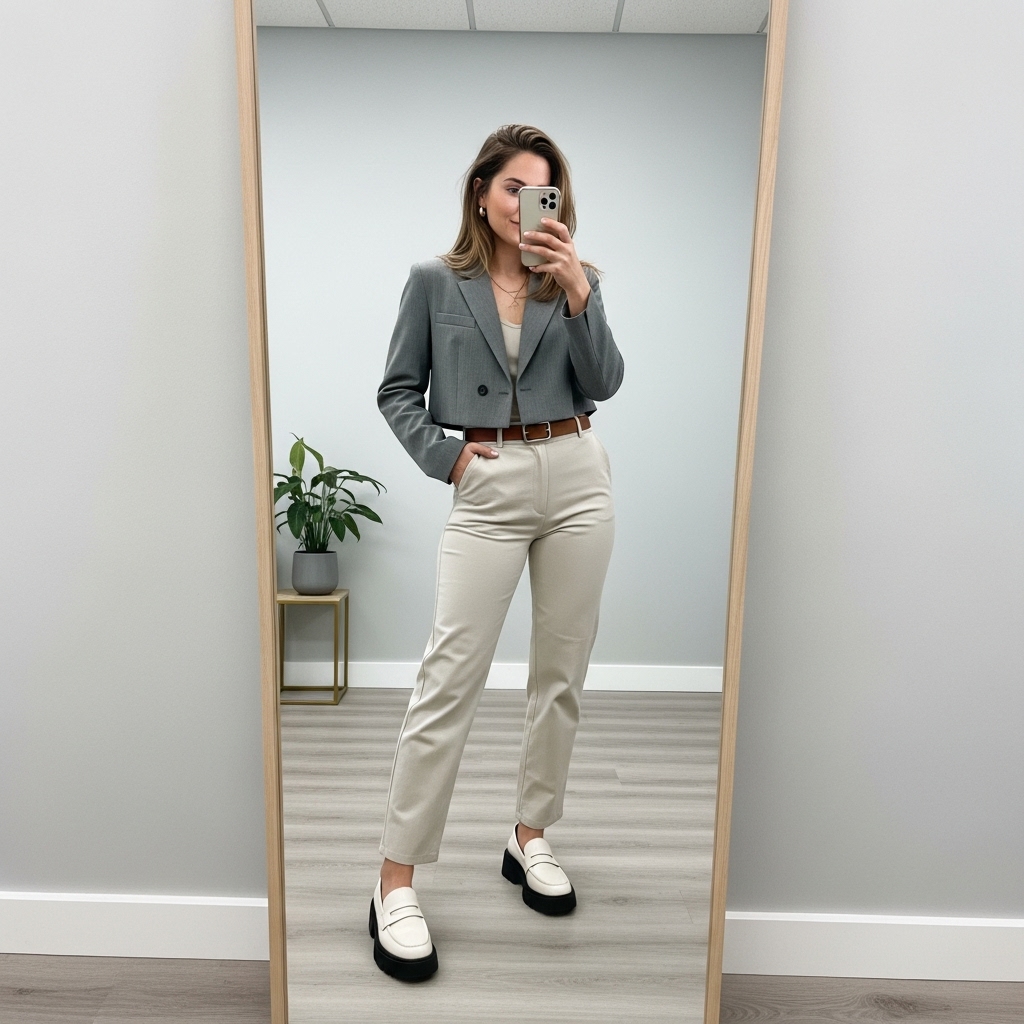 Cropped blazers are a trendy twist on the traditional style, making them great for modern office fashion. Pair with straight-leg pants in matching or complementary tones. Keep your base top simple, like a fitted knit or blouse. Complete with loafers or heeled boots. This look is sharp yet youthful, perfect for younger professionals or creative industries where a modern touch is encouraged.