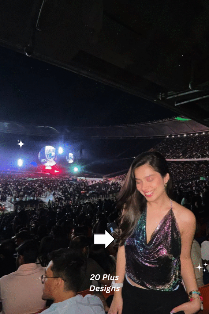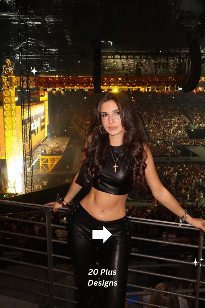 The metallic corset top combined with cargo pants mixes high-fashion edge with streetwear practicality. The corset adds structured glamour, while cargo pants provide flexibility and comfort. This ensemble is perfect for fans who love to stand out while maintaining movement-friendly, concert-appropriate attire.