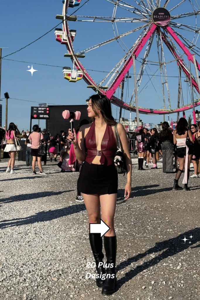 Rich burgundy tones and sleek leather make this halter top and mini skirt ensemble perfect for bold, night-time performances. Knee-high boots extend the edgy aesthetic while ensuring comfort. This outfit blends daring fashion with practicality, giving fans freedom to move while looking runway-ready under concert lights.