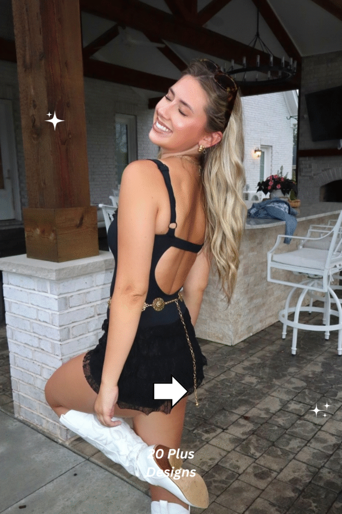 This black lace mini dress paired with a gold chain belt and white western boots fuses romance with playful edge. The lace provides delicate elegance, the chain belt adds glamour, and the boots introduce a fun, stylish twist. Perfect for festival-style or evening concert vibes, this ensemble keeps you stylish, comfortable, and camera-ready.